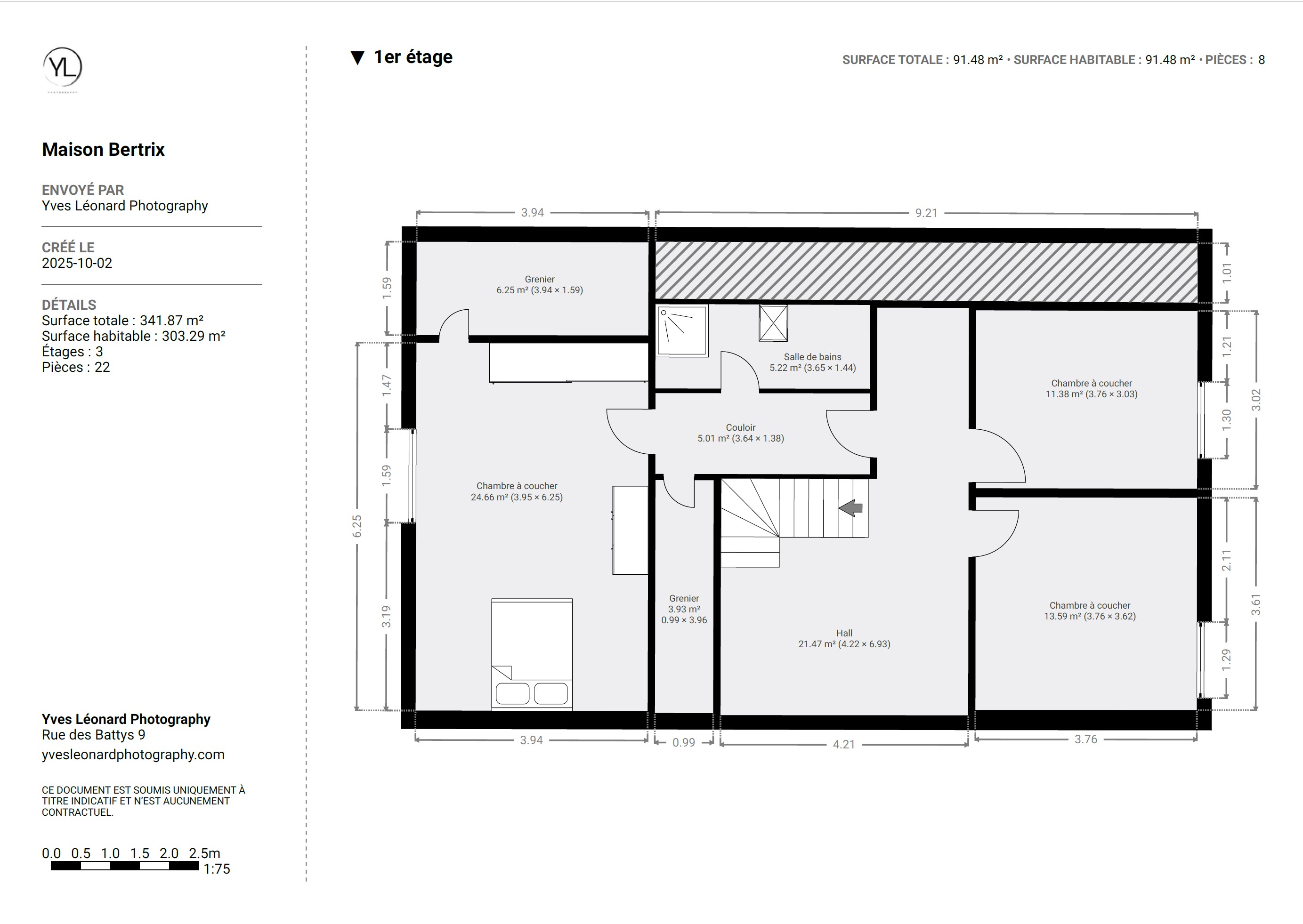 - Au rez-de-chaussée + 1 : hall de nuit , une très grande chambre , salle de douche, deux chambres (15 et 11 m²)